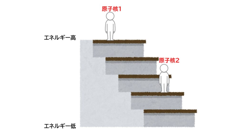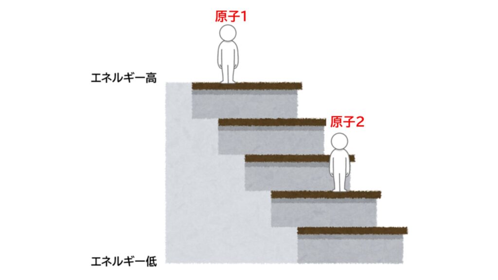 イメージとしては、原子がいくつもの「階段」の段差に分かれて存在しているようなもの。