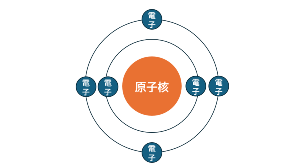 原子は、中央にある「原子核」と、その周囲を回る「電子」からできています。この電子の動き方(=エネルギー状態)が変わるときに、原子はエネルギーを放出したり吸収したりするのです。