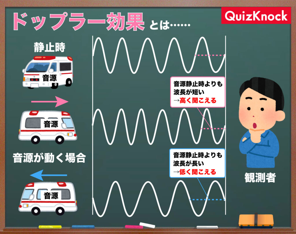 たとえば、救急車のサイレンが近づいたり遠ざかったりすると音の高さが変わって聞こえる現象、ありますよね? あれは「ドップラー効果」と呼ばれるもので、動いているときの波は、止まっているときとは違う聞こえ方になるんです。