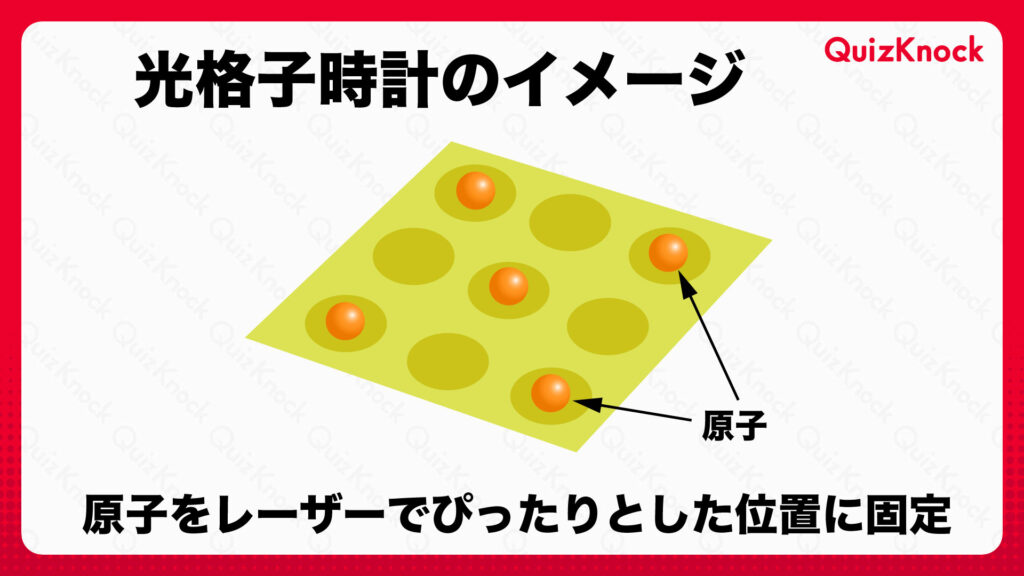 光の格子(=光格子)の中に原子をずらりと並べて、そのわずかな振動を同時に測定することで、従来よりもはるかに正確に「1秒」を測ることができます。