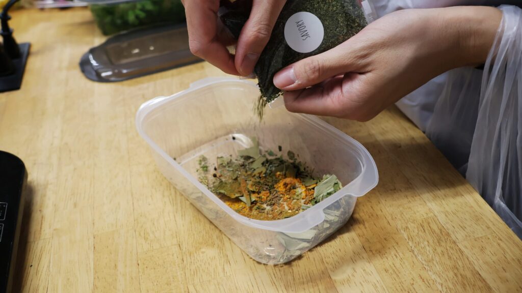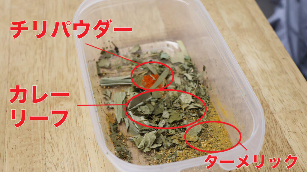 じゃあ、スパイスもタッパーに入れて混ぜておきますか~。