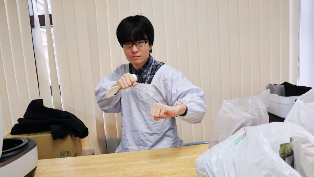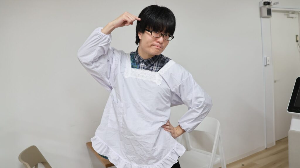 企画者のシャカ夫も割烹着を着て準備万端。そして、料理技術がおぼつかないシャカ夫のサポートのため、Web編集部の石田武蔵もアシスタントにつきます。