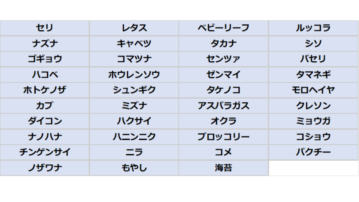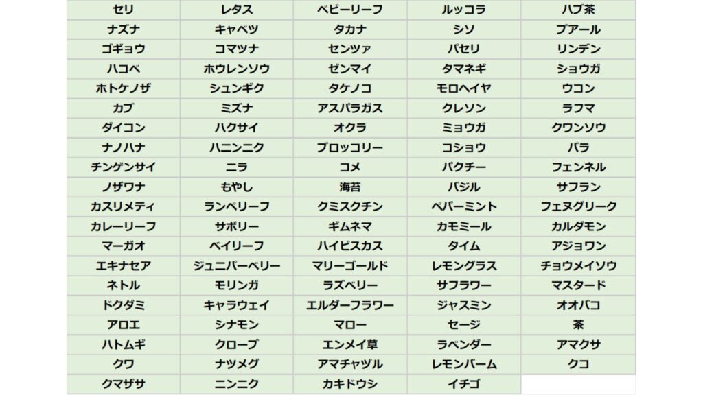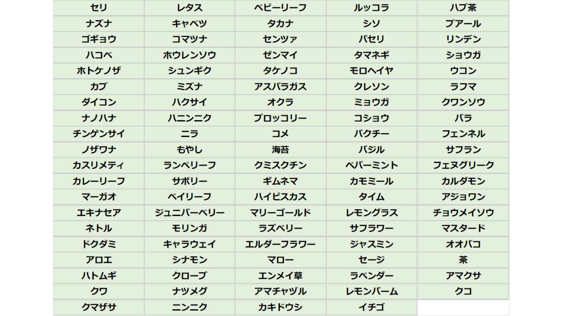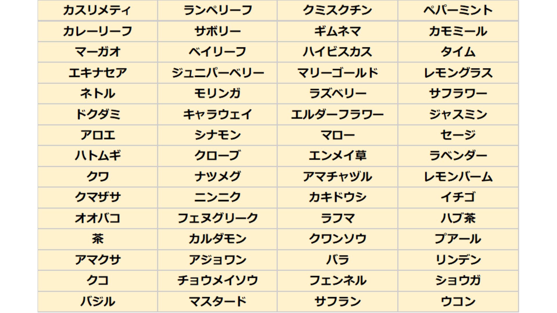 ▲使われている全「草」のリスト。最後の「付け合わせ」をひとつ入れて100種類になる