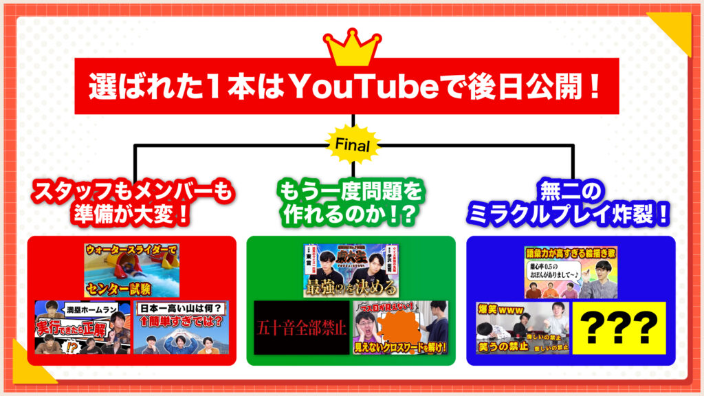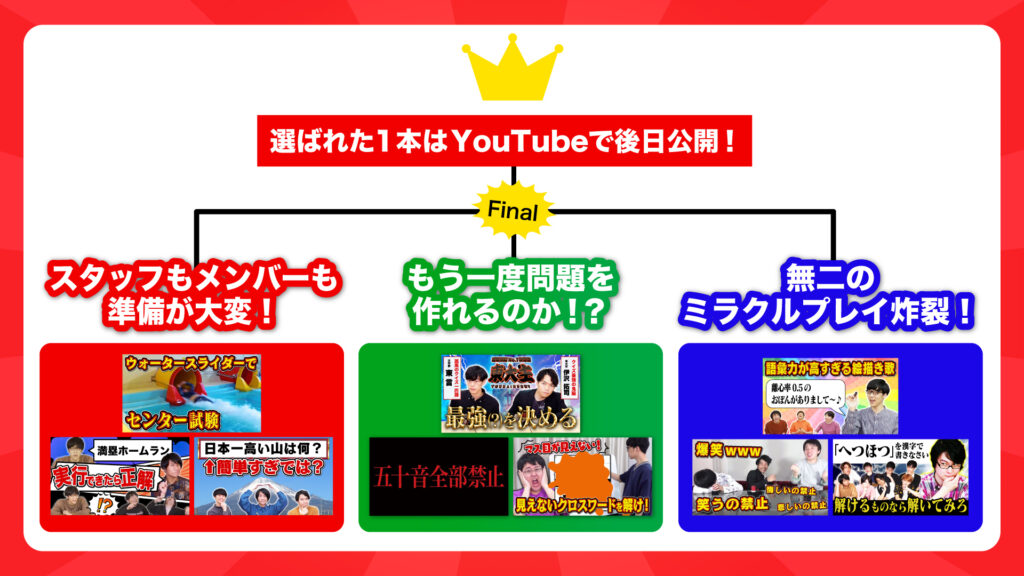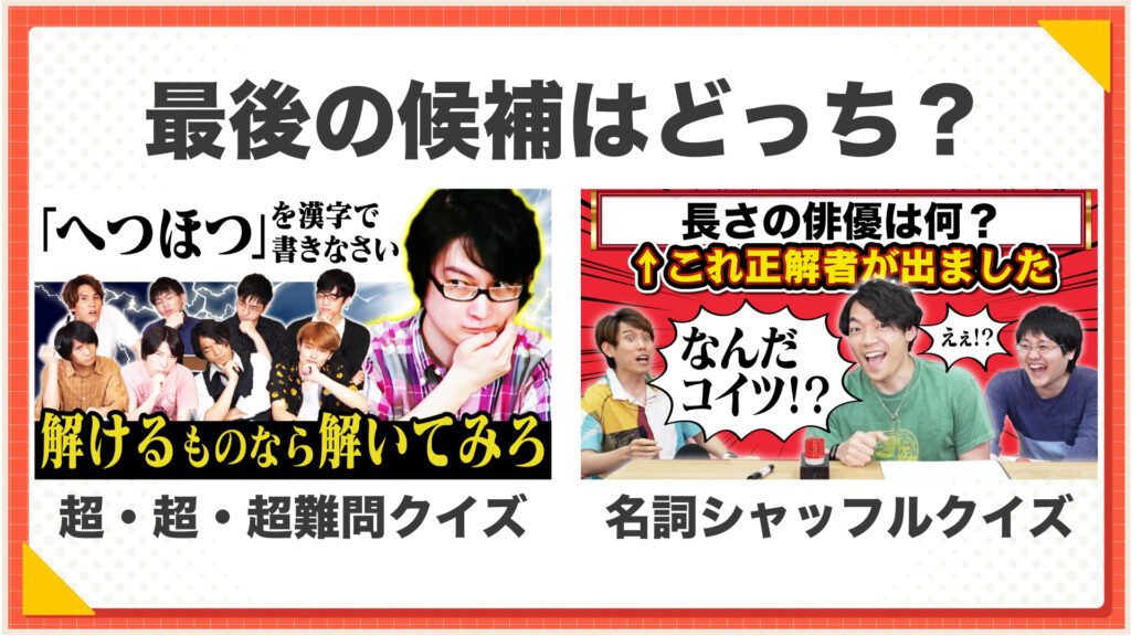 阿部さん:こんにちは〜! では、さっそく投票結果の発表です! 最後の「リバイバル企画総選挙」の候補になったのは……「超超超難問クイズ」です!!