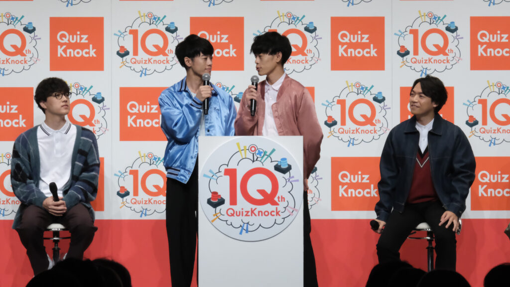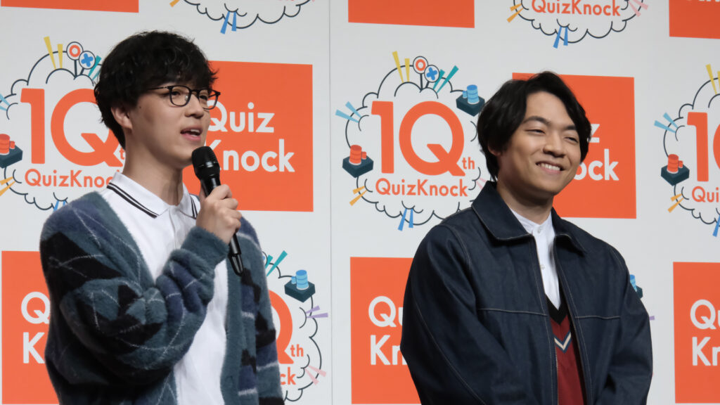記者発表会、2回噛みました! だって〜なんかカメラがたくさんあって緊張したんですよ〜。さて、いよいよQuizKnock10周年プロジェクトが始まります。まだやっていないことに挑戦したい! 今までよりさらに新しく、面白く!僕たちはとっても楽しみなので、皆さんも楽しみにしていてください! そして、僕たちがめちゃくちゃ盛り上げるので、皆さんも一緒に盛り上がっていきましょう!