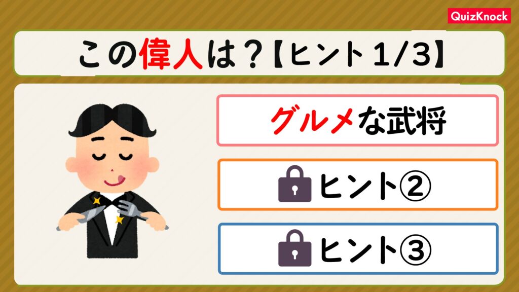 今回は、3つのヒントから歴史上の人物を当てるクイズを用意しました。わかった時点で、解答を漢字またはひらがなで入力してください。