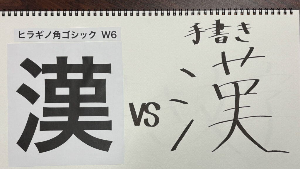ここに2種類の「漢」を用意しました。左が「ヒラギノ角ゴシック W6」、右が手書きです。