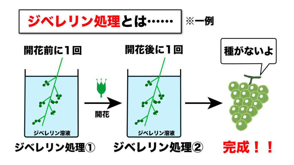 たとえば種なしのぶどうを作るには、「ジベレリン処理」という薬剤につける処理が必要だ。