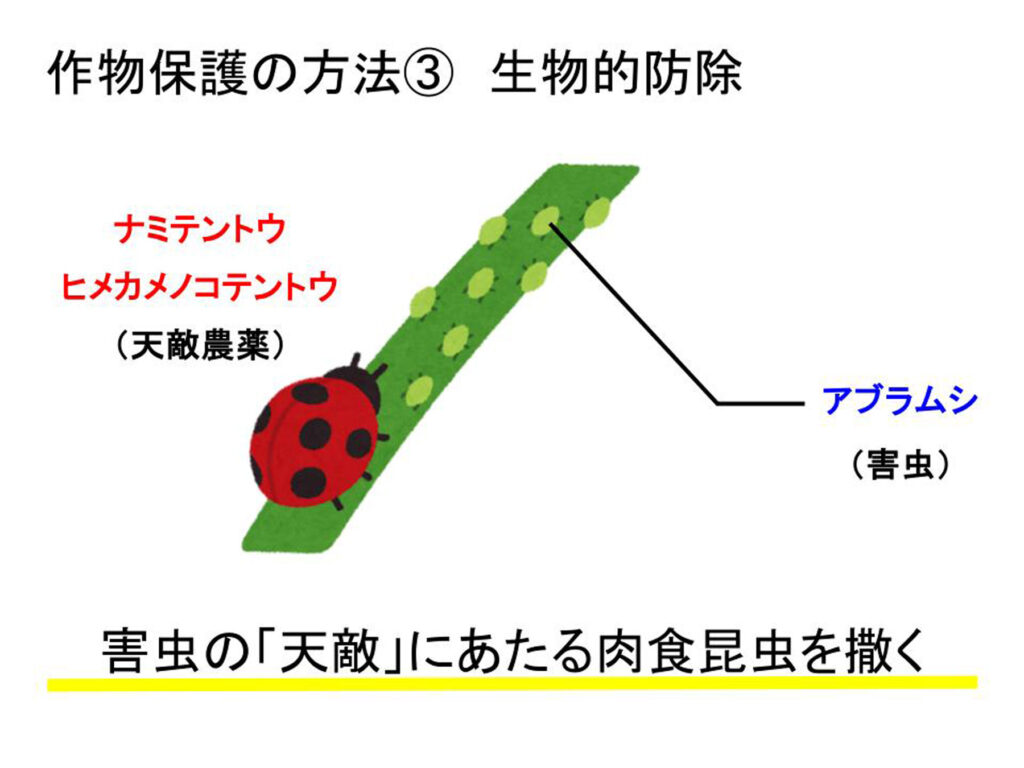 たとえばアブラムシが植物に害を与えている場合、その天敵であるテントウムシを撒いて食べさせることで防除できる。