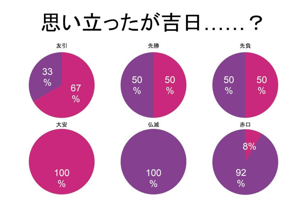 カレンダーに書いてある、六曜というものがありますね。「大安」みたいな吉の日や、「仏滅」のように凶のタイミングがあると言われています。