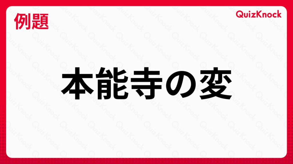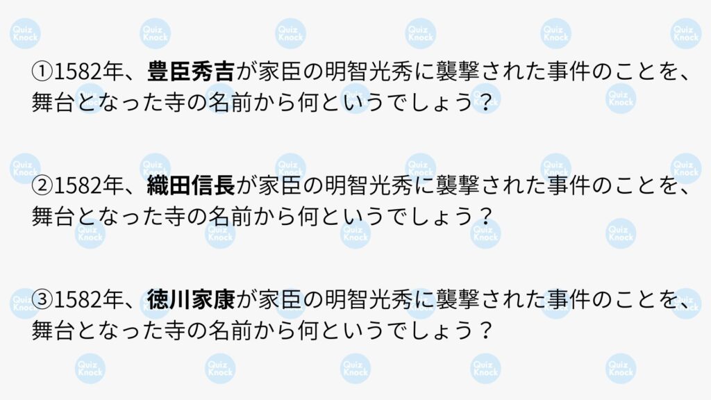次の3つのうち、「本能寺の変」が答えになる問題文として正しいのはどれでしょう?