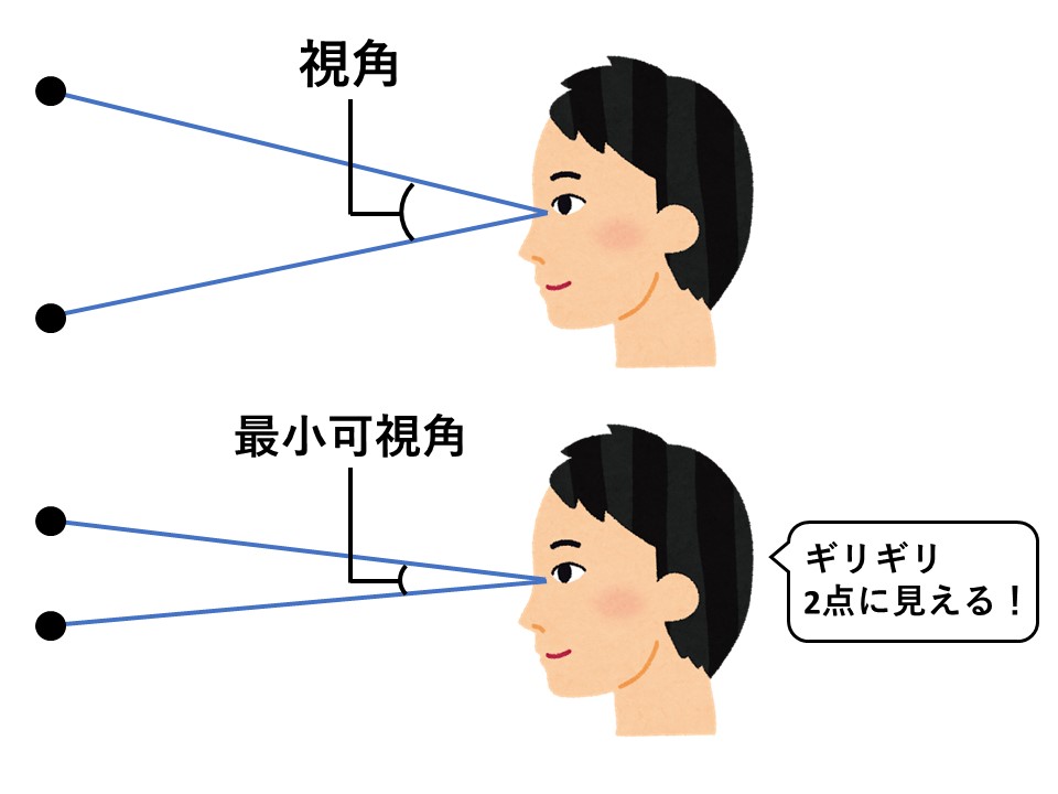 下の図のように、2つの点と眼によって作られる角度のことを「視角」といいます。そして、2つの点を1点ではなく、2点として認識できる最小の視角が「最小可視角」です。
