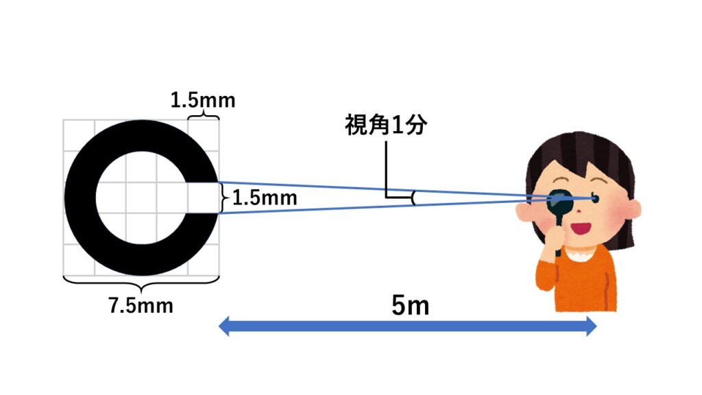 下の図のように、外径が7.5mmのランドルト環を5mの距離から見るとき、切れ目と眼が作る視角は1分になります。