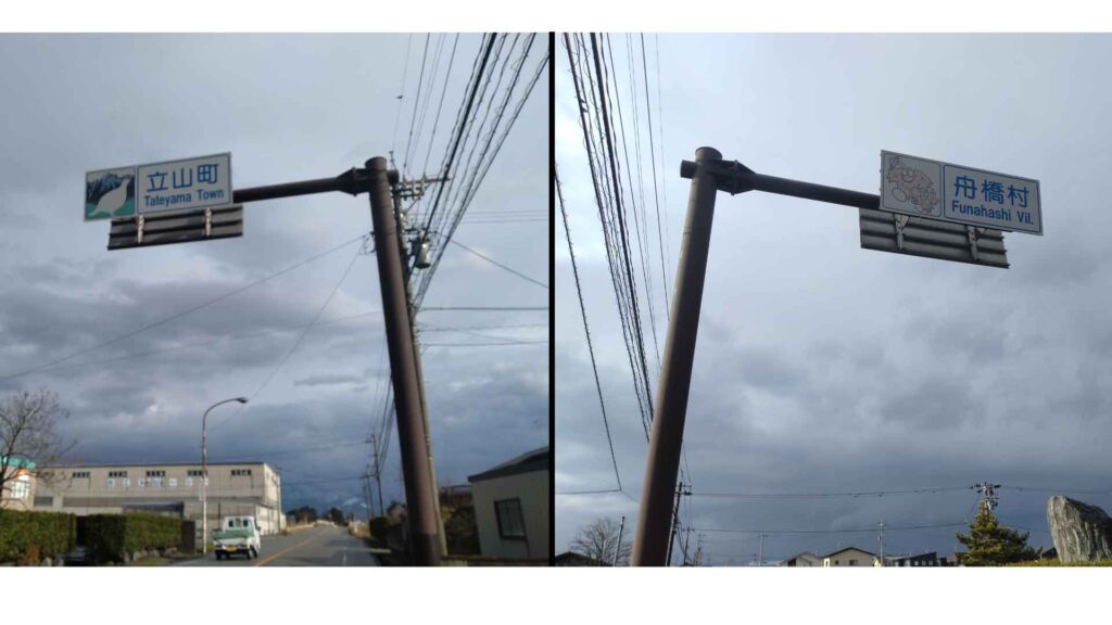 舟橋村ならではのアピールポイントを活かした標語が目を引きますね。またよく見ると、豪雪地帯の富山県らしく信号機が縦型です。
