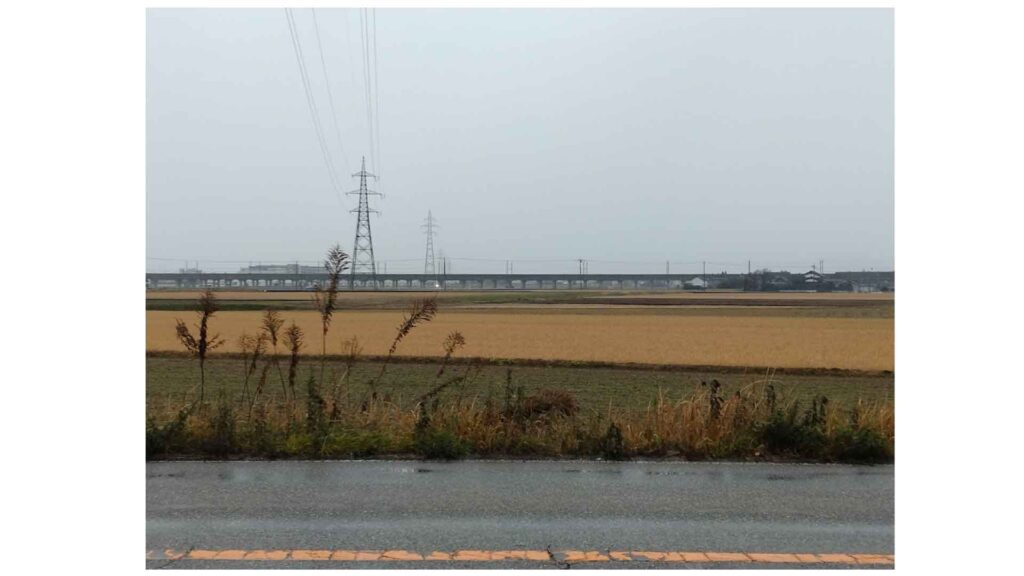 取材時は冬だったので田んぼは閑散としていますが、夏には稲が茂って青々とした光景になります。画面奥には、村の外を通る北陸新幹線の高架も見えます。