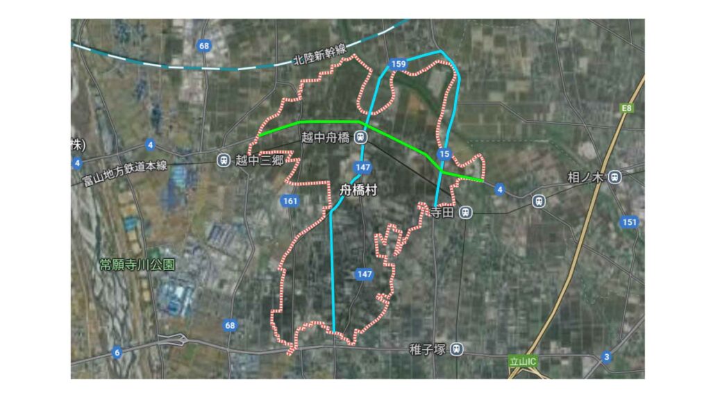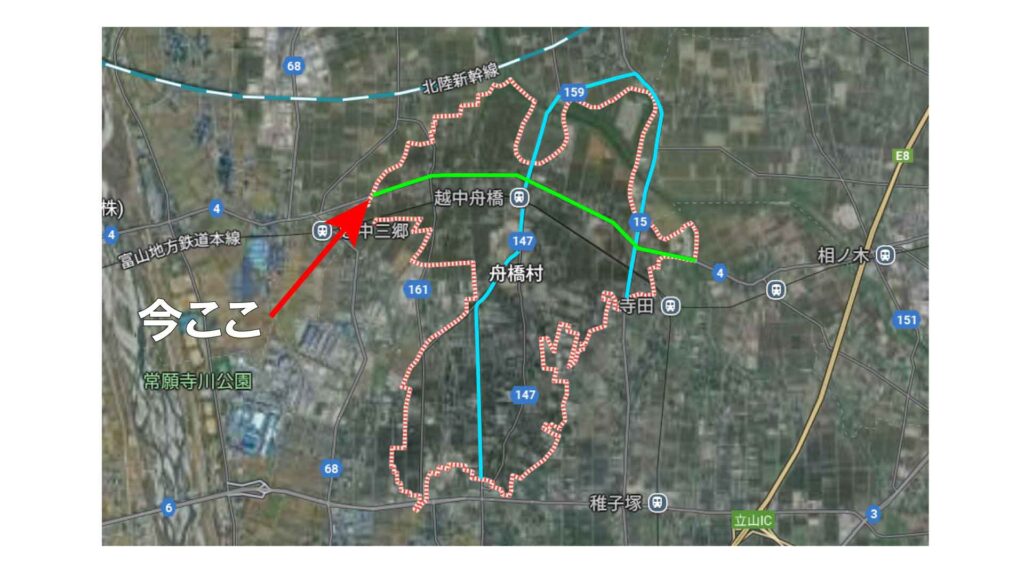 舟橋村には国道は通っていませんが、県道をはじめとする通りが村内を繋いでいます。今回は村を東西に横断する緑色のルートと、南北に縦断する水色のルートを歩いてみました。