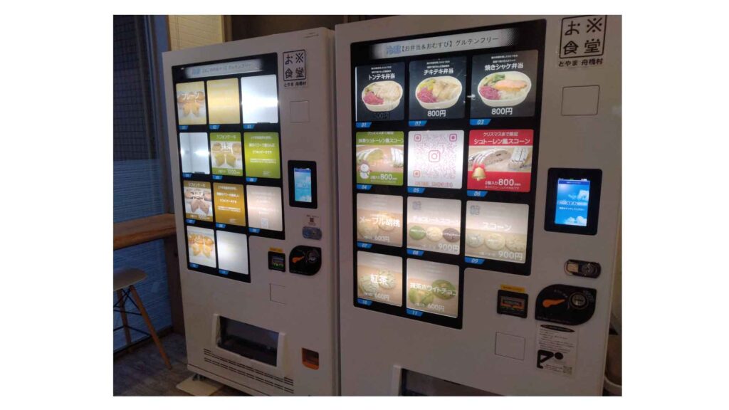 無人の店内に自販機が並んでいます。お弁当とお菓子がメインのようですが、材料に使われる米糀、米粉、生クリーム、塩はすべて富山県産で、特にお米は舟橋村産だそう。村で食べるごはんとして完璧すぎるチョイスではないでしょうか……!