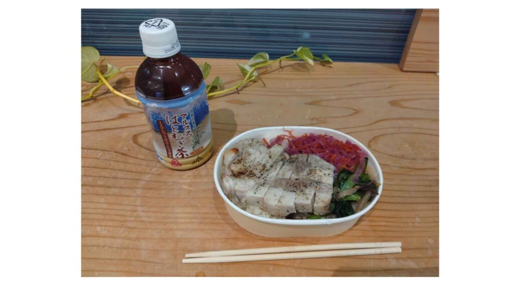 豚肉は塩糀で漬け込んだものとのことですが、歯ごたえはあるけれど筋っぽくなく、味付けが絶妙です。一緒になっている紫色のお漬物も甘めの味付けで、どちらも下に敷かれているご飯によく合っていました。