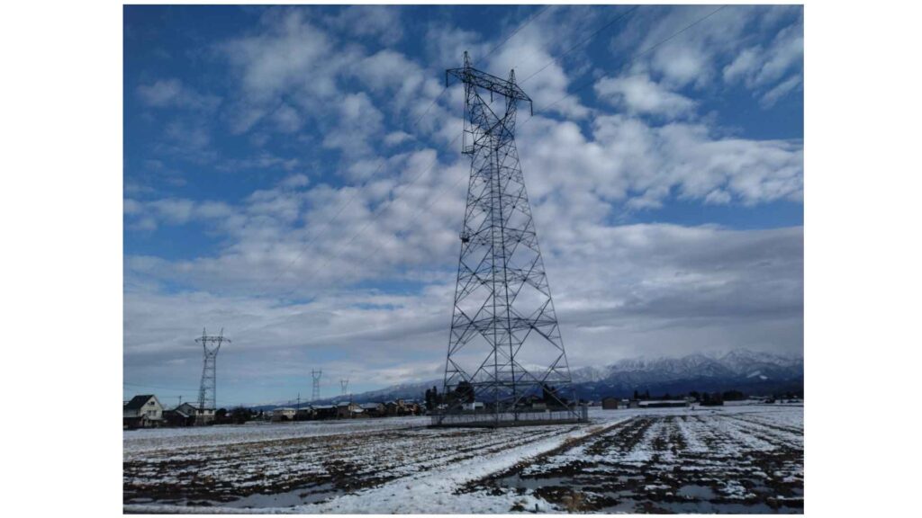 烏帽子型鉄塔は着雪に強い形状の鉄塔であり、山間部などに多いそうですが、このように富山県内では平野部でもよく見かけます。