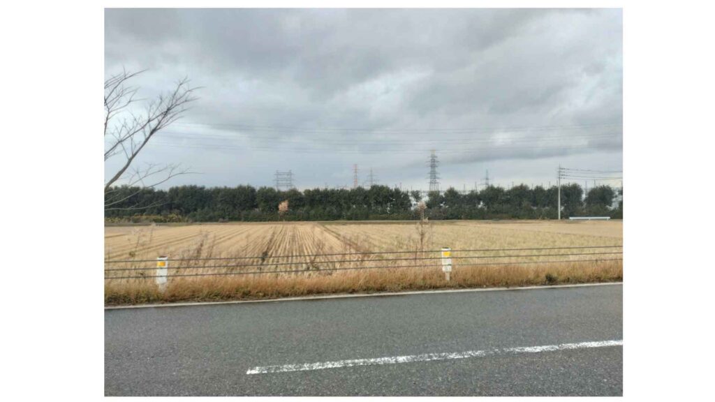 道中、生け垣の向こうに鉄塔が見えてきました。北陸電力の舟橋変電所です。