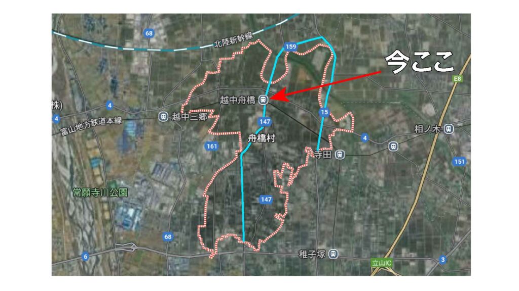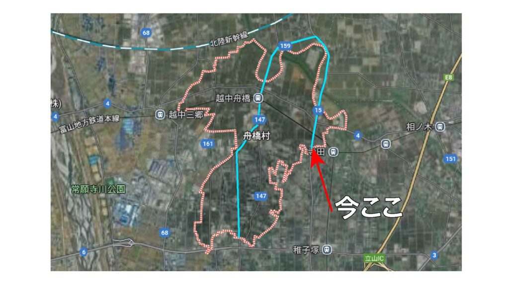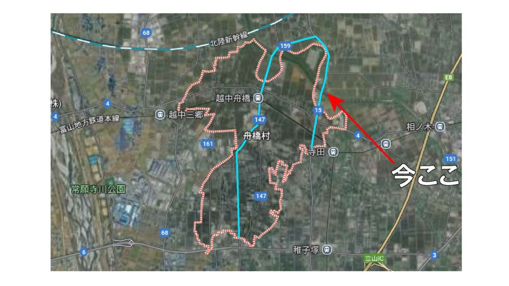スタート地点に戻って北上すると、先ほどの日本一たい焼・富山舟橋店のある交差点に出ます。そのまままっすぐ進むと、北の村境にたどり着きました。