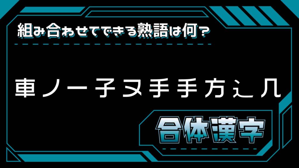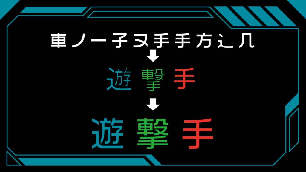 「車ノ一子ヌ手手方辶几」のうち、「ノ」「一」「子」「方」「辶」を合体させると「遊」! 「車」「ヌ」「手」「几」を合体させると「撃」! 残りの「手」と合わせると完成するのは「遊撃手(ゆうげきしゅ)」となります。