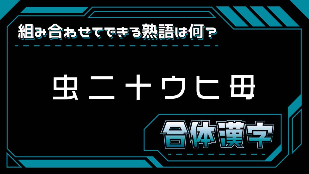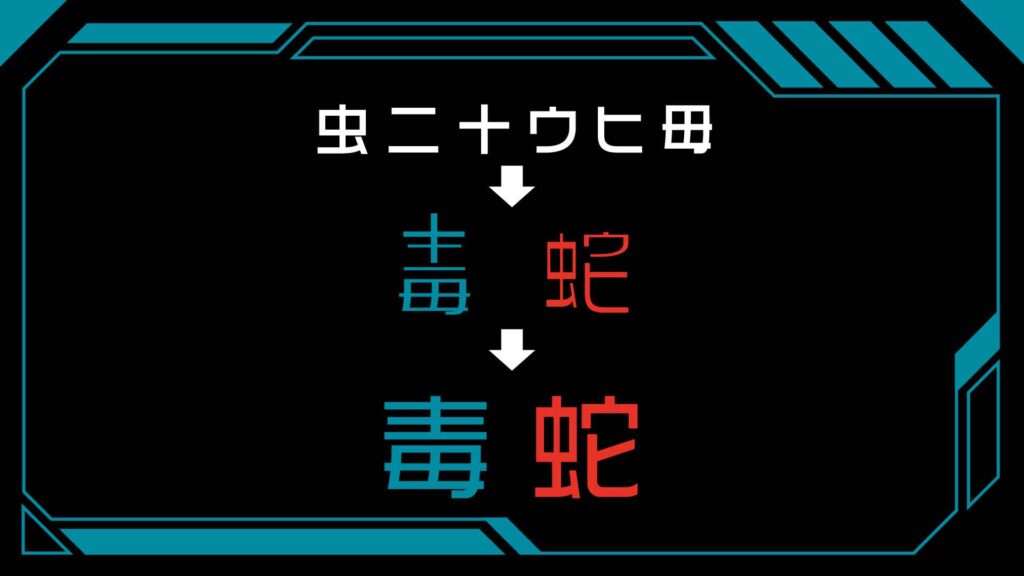 「虫二十ウヒ毋」のうち、「二」「十」「毋」を合体させると「毒」! 「虫」「ウ」「ヒ」を合体させると「蛇」! すなわち完成するのは「毒蛇」となります。