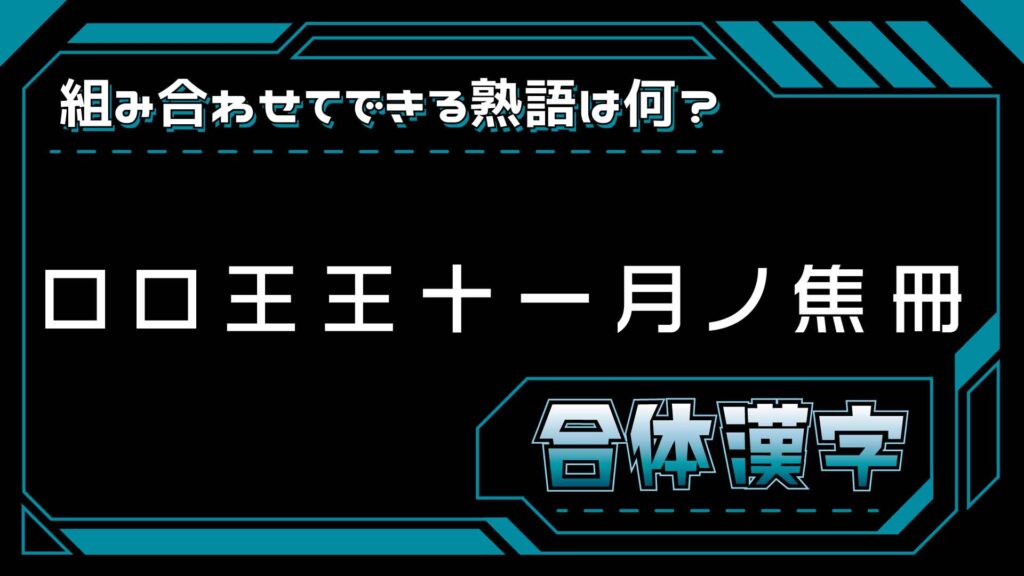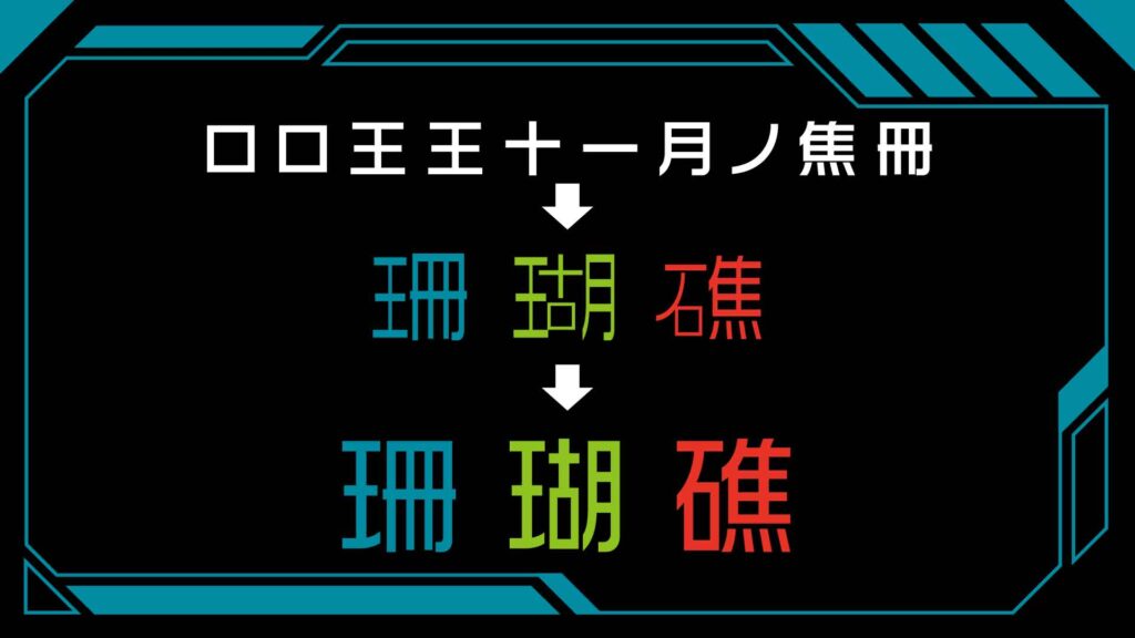 「ロロ王王十一月ノ焦冊」のうち、「王」「冊」を合体させると「珊」! 「王」「十」「ロ」「月」を合体させると「瑚」! 残りの「一」「ノ」「ロ」「焦」を合体させると「礁」! すなわち完成するのは「珊瑚礁(さんごしょう)」となります。