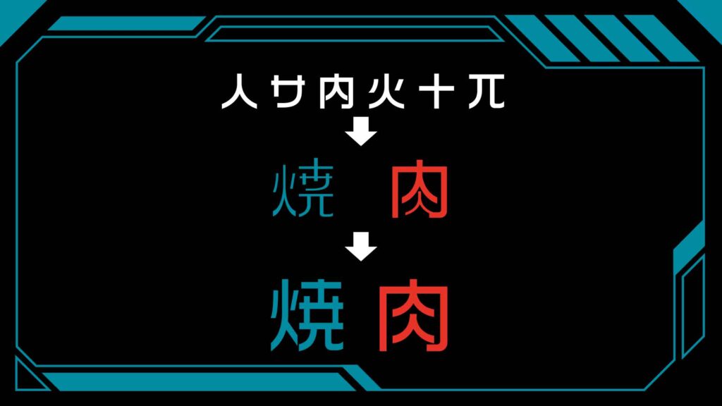 「人サ内火十兀」のうち、「サ」「火」「十」「兀」を合体させると「焼」! 「人」「内」を合体させると「肉」! すなわち完成するのは「焼肉」となります。
