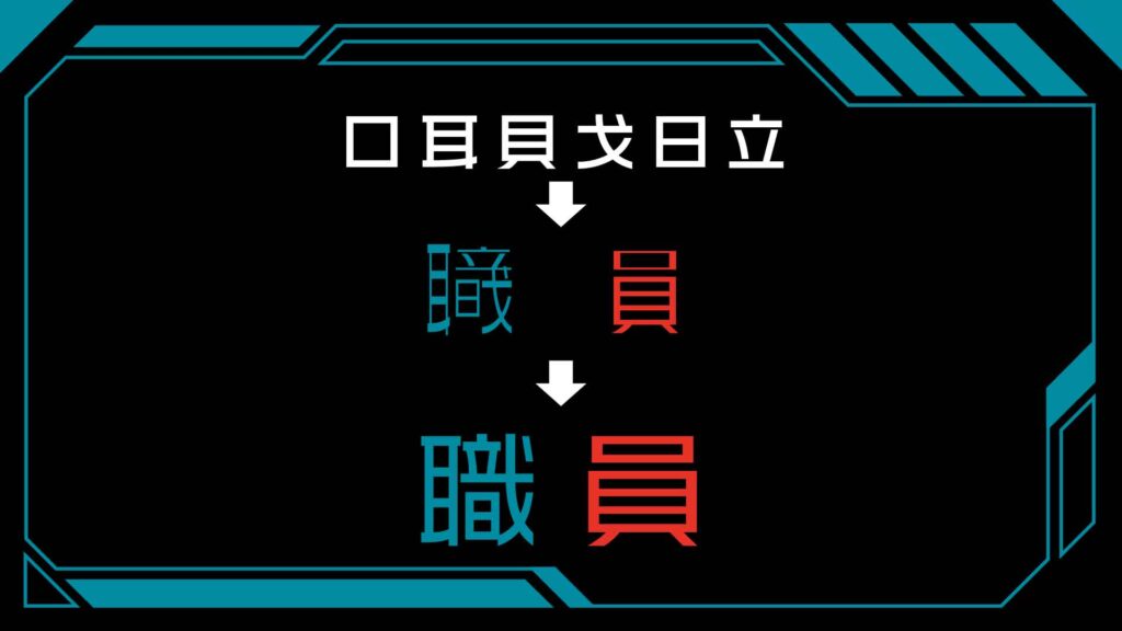 「口耳貝戈日立」のうち、「耳」「戈」「日」「立」を合体させると「職」! 「口」「貝」を合体させると「員」! すなわち完成するのは「職員」となります。