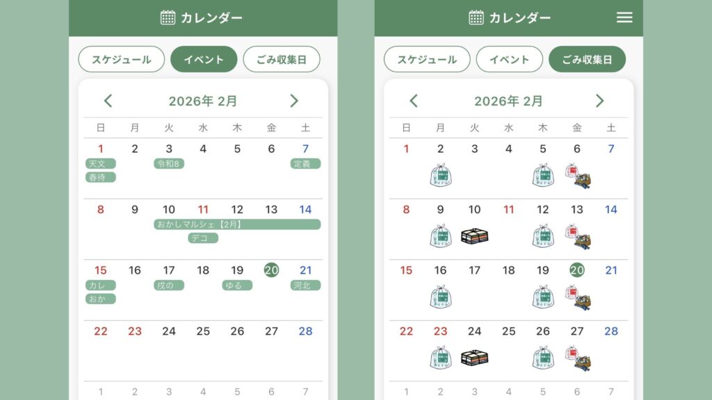 アプリ版では「カレンダー」の機能があって、地域のイベントの情報や、ごみの収集日も一目で確認できるんですよ。