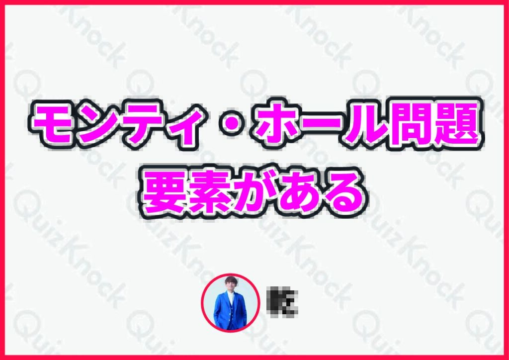 モンティ・ホール問題:有名な確率の問題。「1つだけアタリが入っている3つの選択肢の中から、プレイヤーが1つを選択する。そのあと、正解を知っている司会が、残った2つのうちハズレの選択肢を教えてくれる。そこで『最初の選択をそのままにするか、もう1つの選択肢に変えるか』を問う」というもの。