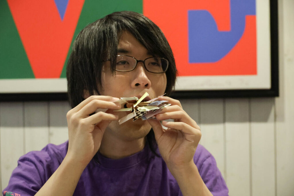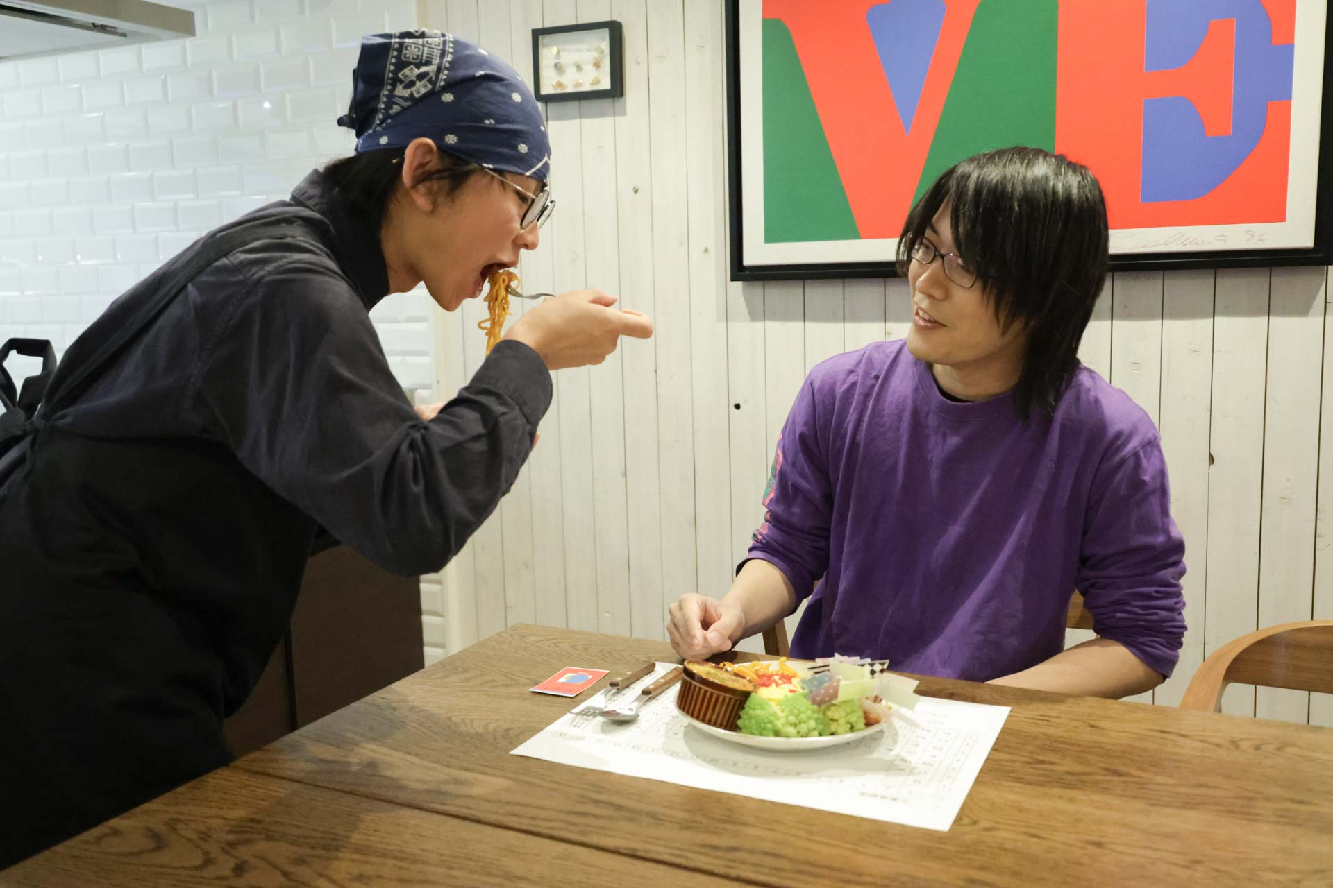先ほど選んだ一番右のパスタを食べますか? それとも真ん中のパスタを食べますか? モグモグ