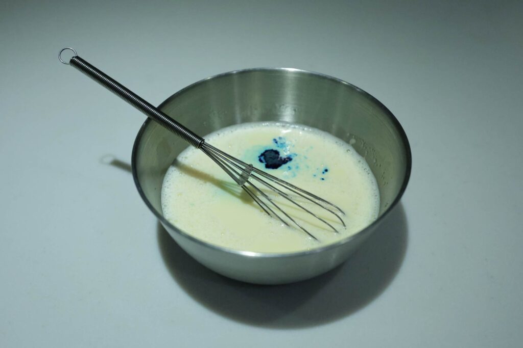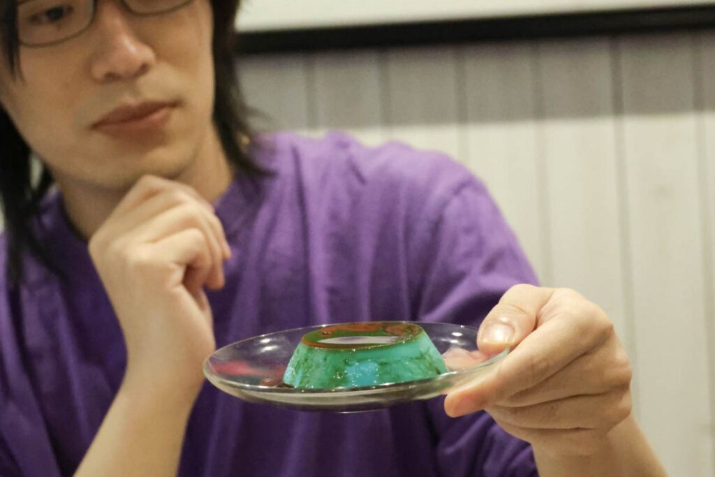 普通のプリンに、青い食紅をちょっと入れただけです。