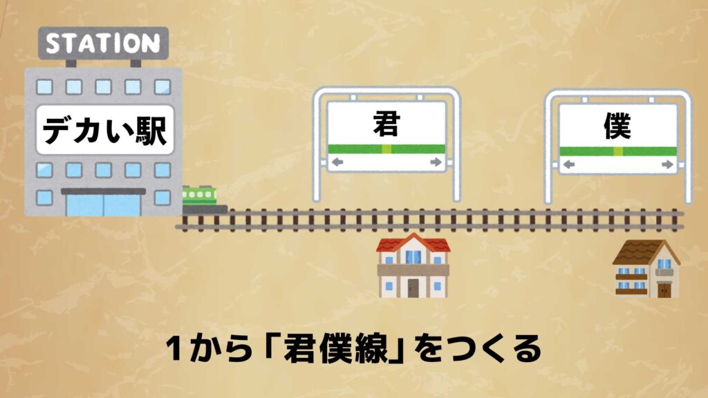 ということで、ここからは改めて自力で線路を引くことを考えよう。「君僕線」の総延長(ターミナル駅から君駅経由、僕駅まで)は、いったん短めに10kmくらいだと仮定する。