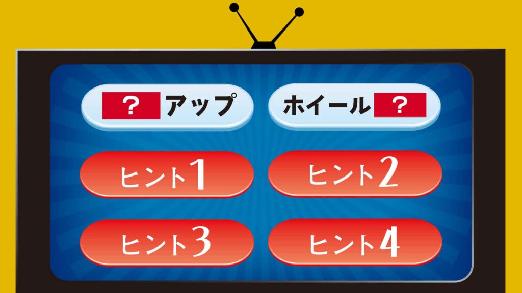 画像にある4つの「?」に共通するカタカナ3文字の言葉を入れ、4つの言葉を同時に作ってください。