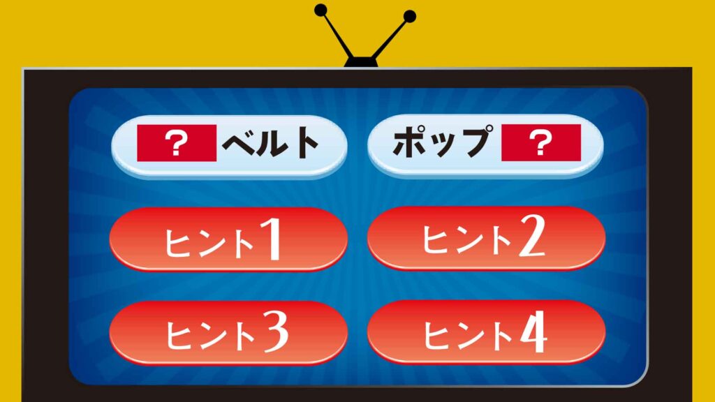 画像にある4つの「?」に共通するカタカナ3文字の言葉を入れ、4つの言葉を同時に作ってください。