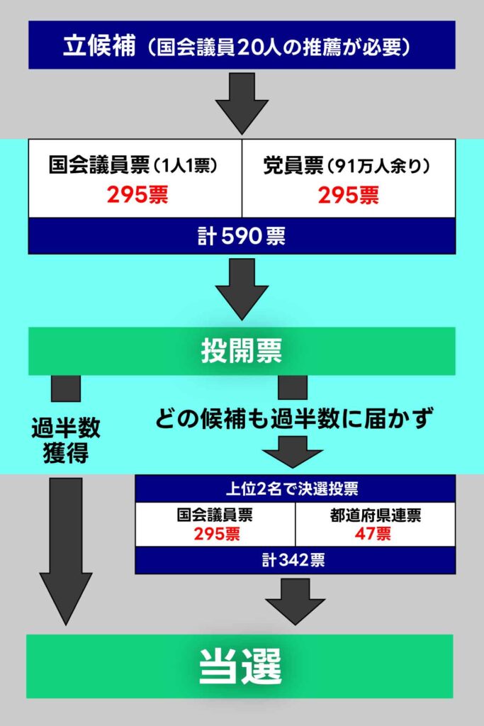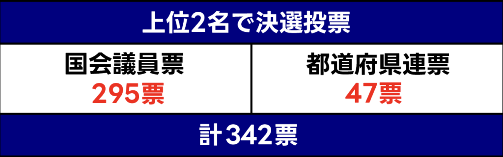295票あった党員票は、決選投票では各都道府県の党員代表者による47票まで減少する。候補者から見れば、不確定要素ともいえる一般党員の票が減り、ある種「コントロールしやすい」国会議員票の割合が増えることになる。1回目の投票とは全く別のゲームということだ。