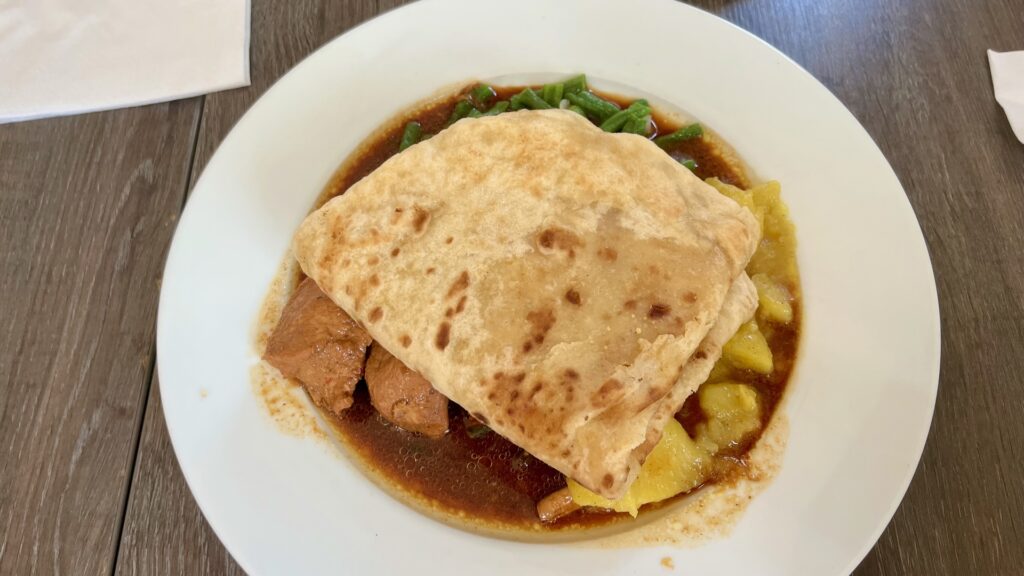 鶏肉とじゃがいものカレーのようなものと薄焼きパンのセットでした! ピリ辛なデミグラスソースに近い味わいに、もっちりとしたパンがよく合います。