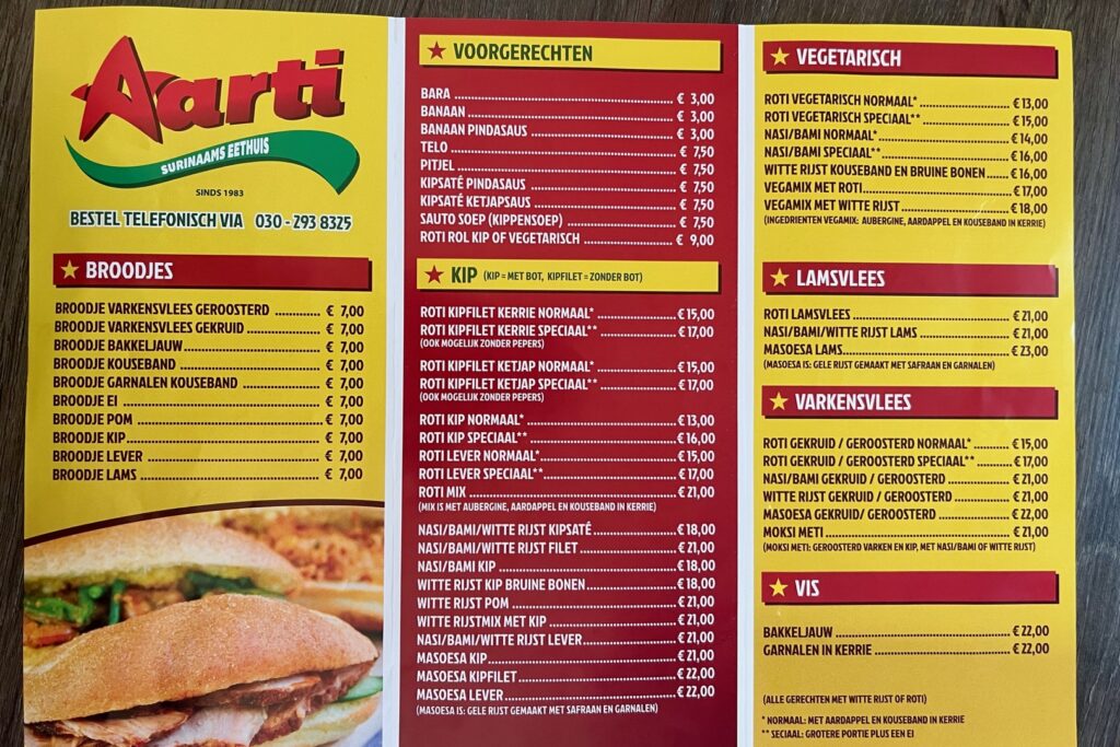 スリナム料理は、国の複雑な成り立ちと民族構成を反映しています。私がいただいた薄焼きパン "roti (ロティ)" はインドでよく見られ、味付けの "ketjap (ケチャップ)" はトマトケチャップではなく、インドネシア由来の醤油だそうです。