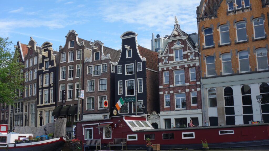 ここで視線を運河より少し上げて、運河沿いの家々を観察してみましょう。冒頭でも紹介したとおり、細長い形が特徴的。4〜5階建てが多いように思います。