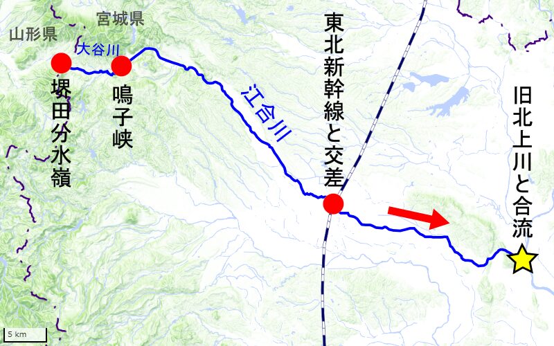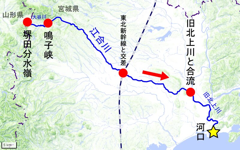 石巻市に入ったところで、江合川は旧北上川と合流します。ここから河口まで、旧北上川として流れていきます。