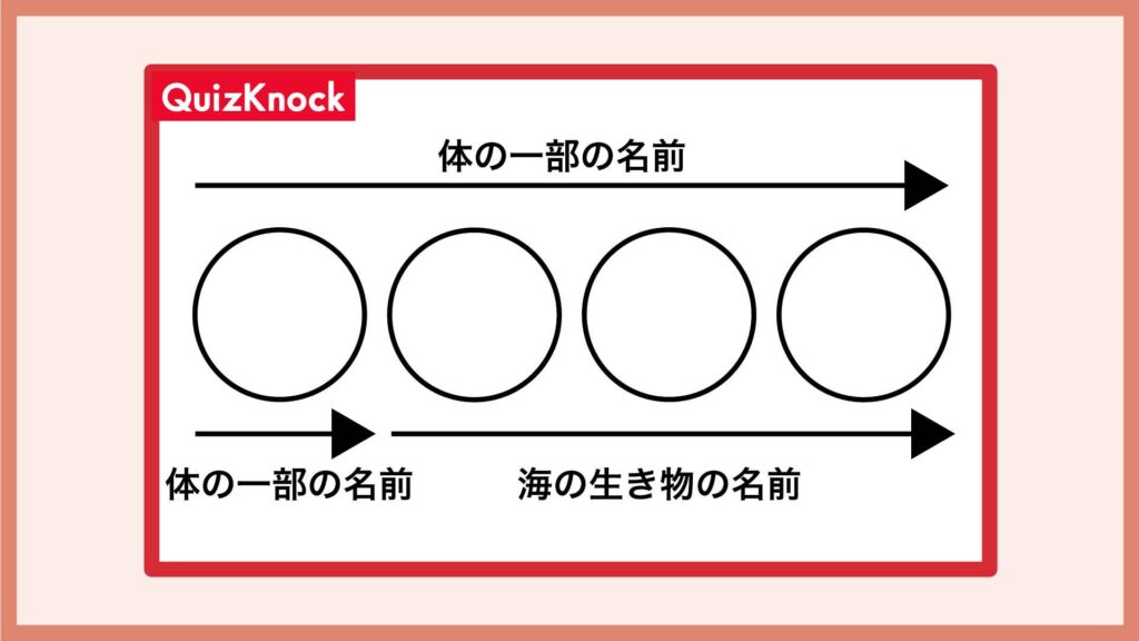 〇と矢印、そしてそれぞれ矢印の方向に読んだときに当てはまる言葉の説明を表示した画像をお見せしますので、「〇〇〇〇」全体に入る言葉をお答えください。