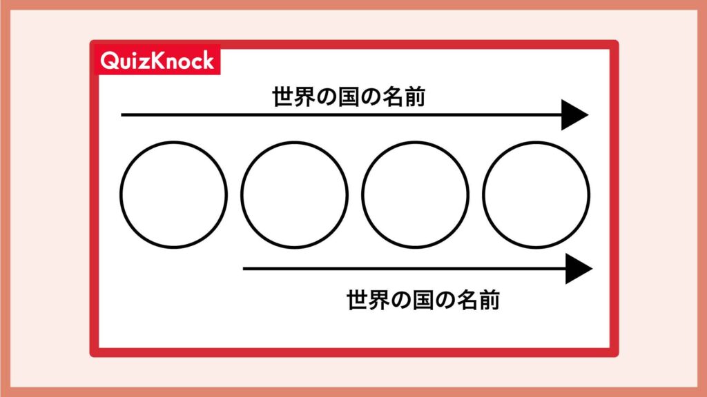 〇と矢印、そしてそれぞれ矢印の方向に読んだときに当てはまる言葉の説明を表示した画像をお見せしますので、「〇〇〇〇」全体に入る言葉をお答えください。