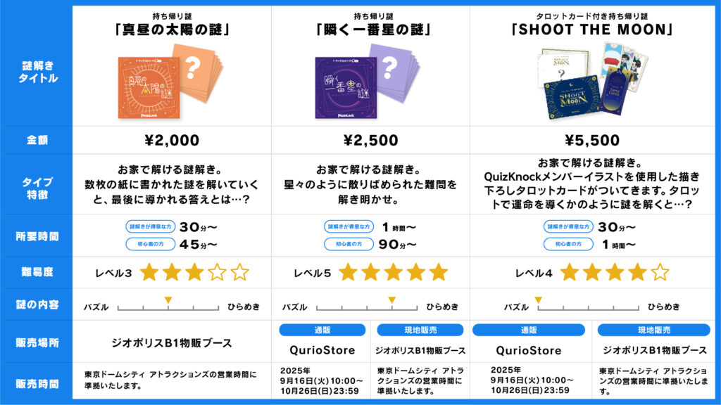 持ち帰り:東京ドームシティの物販ブースでは、太陽・星・月をテーマにした3つの「持ち帰り謎」(おうちで楽しめる謎解き)を販売中。「星」「月」の2つは、QurioStoreでの通販でも購入可能。