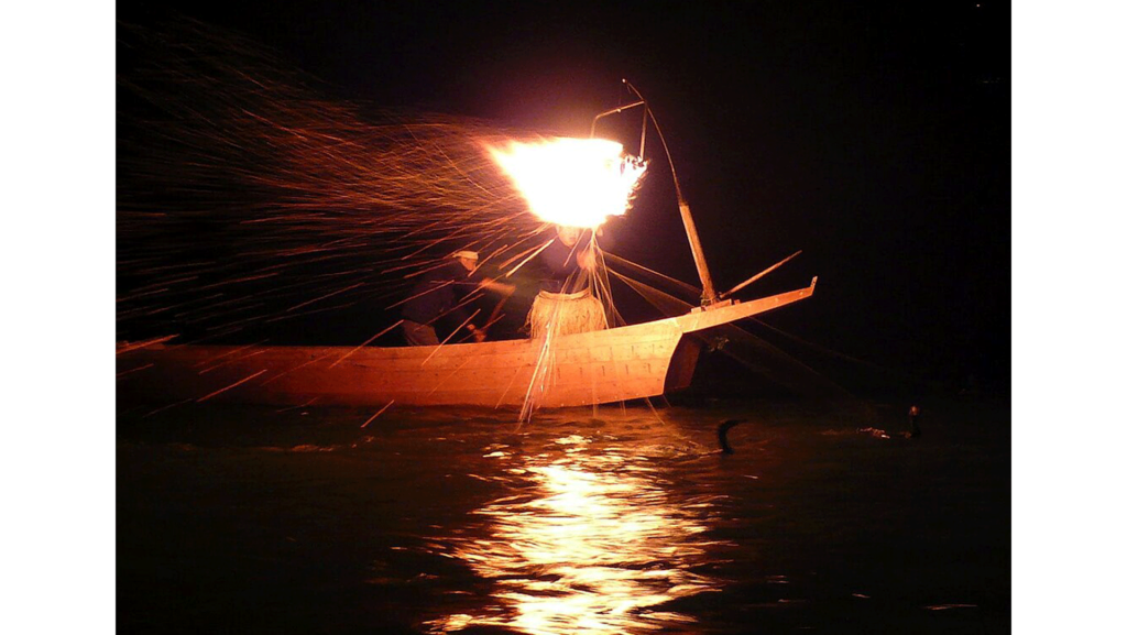 ▲伝統漁法「鵜飼」の様子。鳥の鵜(ウ)を操ってアユなどを獲る