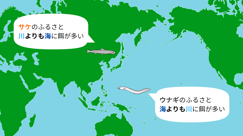 川で生まれ海で成長するサケと、海で生まれ川で成長するウナギ。このような対照的な生態の理由は一体何でしょう? サケがわざわざ降って行く先の海、そんなにいい場所ならウナギも川になんて行かずにずっと海にいたらいいのでは?