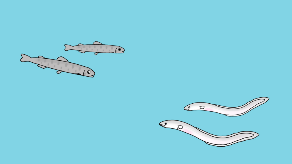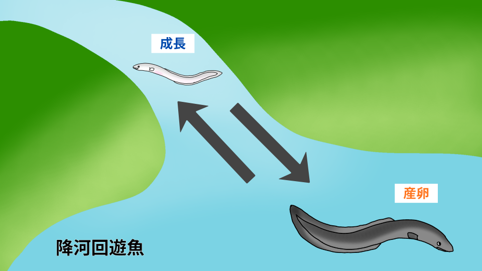 遡河回遊魚とは逆に、海で生まれ川で成長し、産卵のために海に帰る(河を降る)魚を降河回遊魚と呼びます。ウナギなどに代表されます。