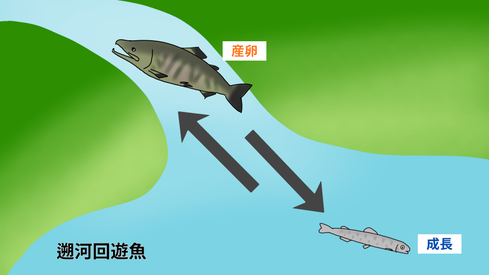 川で生まれ海で成長し、産卵のために川に帰る(河を遡る)魚を「遡河回遊魚」といいます。サケの仲間がその代表例です。