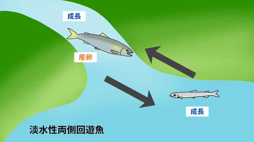 産卵とは無関係に海と川の両方を成長の場とする魚を両側回遊魚といいます。アユやヨシノボリなど川に産卵場があるものを淡水性両側回遊魚、ボラやスズキなど海に産卵場があるものを海水性両側回遊魚といいます。